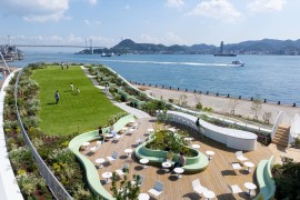 (左)関門海峡にかかる「関門大橋」を待の前に眺める絶景の「なみなみテラス」全景。
