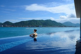 (左)インフィニティプールで過ごす。朝焼け、夕暮れ時、関門海峡の景色はいつもドラマチック。