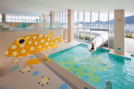 (右)全天候型屋内プール「ふぐプール」。全長約30mのウォータースライダーは、関門海峡の潮流との一体感を味わうスリリングな施設。幼児用のスライダーもあり。